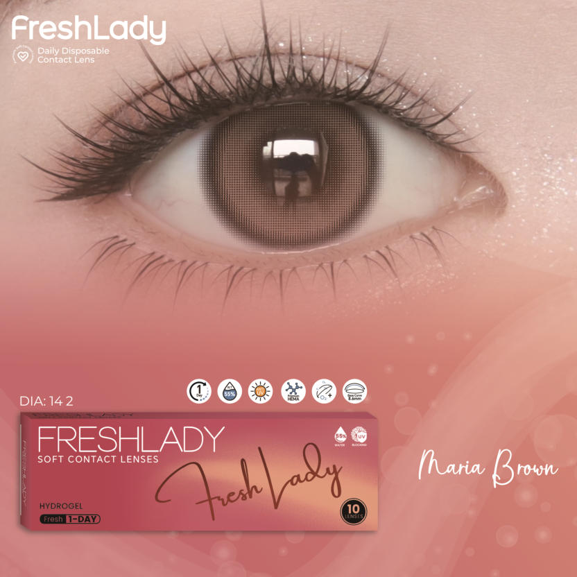 FreshLadyPolar Light Brown , Maria Brown, Fog Peal Brown, Dawn Gray, Blue Gray, AD.Arena, Sorayama Gray, MoonlightDAILY DISPOSABLE SOFT CONTACT LENS10 LENSES PER BOX55% UV H2O0.080 +- 0.020 @ -3.00 D8.6MM14.0, 14.2, 14.5MMPlano0.50 to -5.00 D (0.25 D)-5.50 to -8.00 D (0.50 D)
